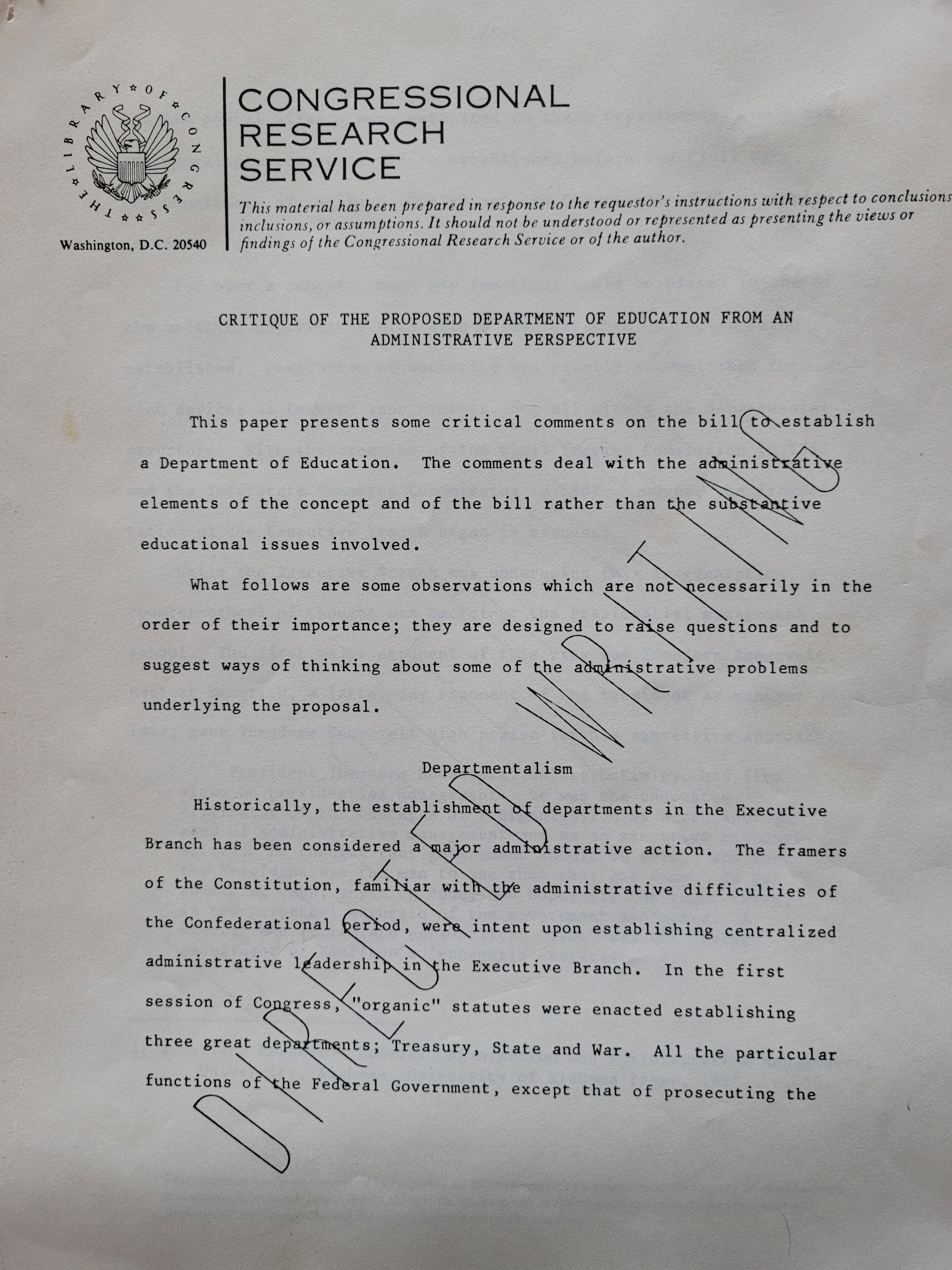 Below is a memo written by an expert at CRS in 1979 in response to a direct request from Congress. Whether it was a member or a committee who sought the memo is no matter. What is interesting is the author’s thinking about creating a Department of Education (ED) and its ringing conclusion: “[I]t is based on a questionable administrative theory. It will be … highly responsive to a relatively small interest group constiuency…. All in all it is a bad idea at the wrong time.”